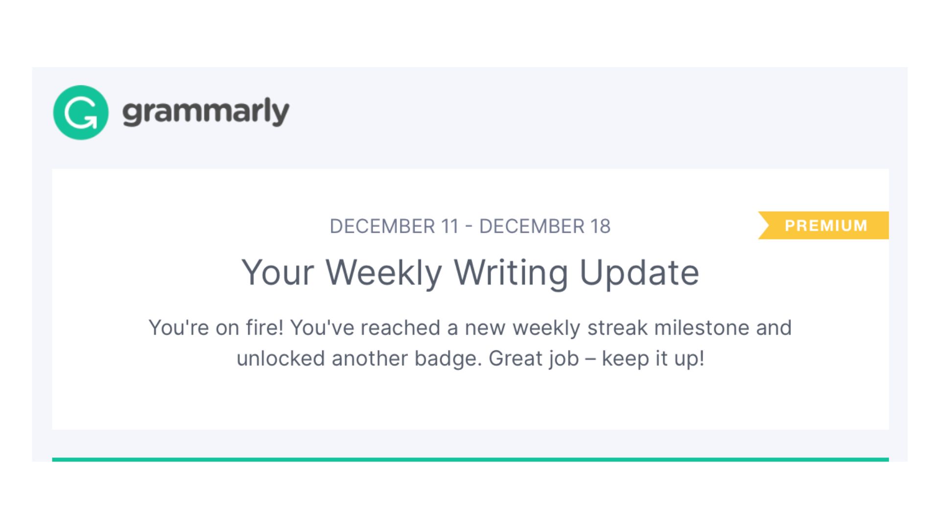 Their Zero Party Data is unique to the customer in their Weekly Writing Update Email. They mention the streak of writing that the user has completed. The email also mentions: